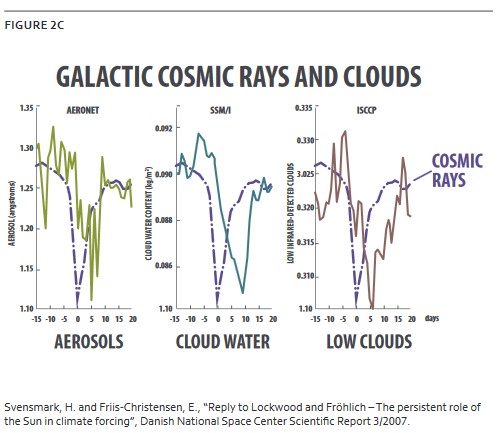 Une étude de 2009 de Svensmark et de ses associés montre que le nombre de nuages bas, la quantité d’eau contenue dans les nuages, et le nombre d’aérosols formateurs de nuages, diminuent tous dans les jours suivant les baisses soudaines de rayonnement cosmique (causées par des irruptions soudaines d’activité magnétique solaire) (figure 2a, 2b, 2c).