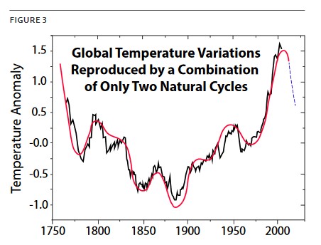 En examinant l’interaction de ces deux cycles naturels, ils ont découvert qu’à eux seuls ils sont responsables de la plus grande part du changement climatique au cours des siècles derniers, y compris les tendances récentes au réchauffement – indiquant là encore qu’il n’y a quasiment aucune raison de s’inquiéter des effets du CO ? [2] (figure 3).