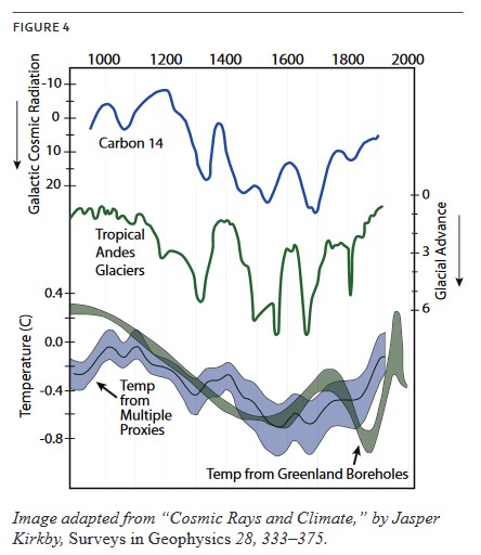 De plus, on observe dans cet intervalle des périodes d’augmentation de la glaciation dans la Cordillère des Andes, correspondant là encore à des accroissements périodiques du flux de rayonnement cosmique. Avant cela, entre les années 900 et les années 1200, la température était plus élevée (c’est le fameux « Optimum climatique médiéval »), le flux de rayonnement cosmique plus faible, et la glaciation dans les Andes moindre (voir figure 4).