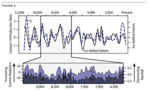 De même, avec encore plus de précision, les variations des précipitations dans la péninsule Arabique, relevées entre 7600 et 4200 av. JC, montrent une très forte corrélation avec variations du flux de rayonnement cosmique [5] (voir figure 6).