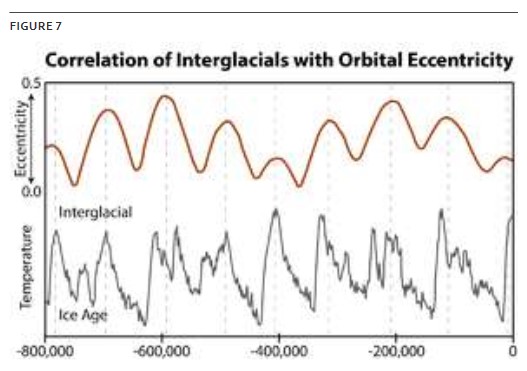 Au cours du dernier million d’années, les cycles d’âge glaciaire ont eu la plus forte corrélation avec les changements de l’excentricité de l’orbite de la Terre autour du Soleil. Pour les deux millions d’années avant cela (d’il y a trois millions d’années à un million d’années), les variations du climat terrestre correspondent mieux aux changements d’inclinaison de l’axe de la Terre (figure 7).