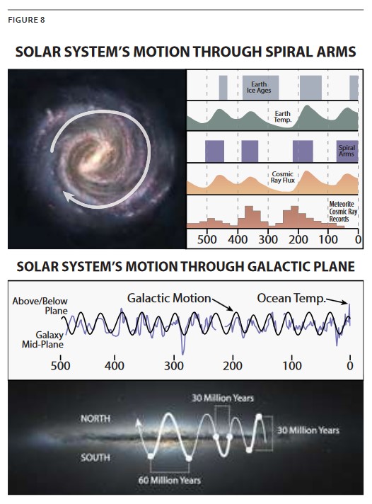Quand le Système solaire est au-dessus ou au-dessous du plan de la galaxie, on pense que le flux de rayonnement cosmique baisse, et les relevés océaniques présentent des températures relativement plus élevées (en accord avec l’hypothèse de Svensmark) ; quand le Système solaire passe dans le plan galactique, on pense que le flux de rayonnement cosmique augmente, et les relevés océaniques présentent des températures relativement plus basses (en accord avec l’hypothèse de Svensmark) (figure 8).
