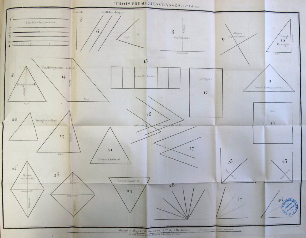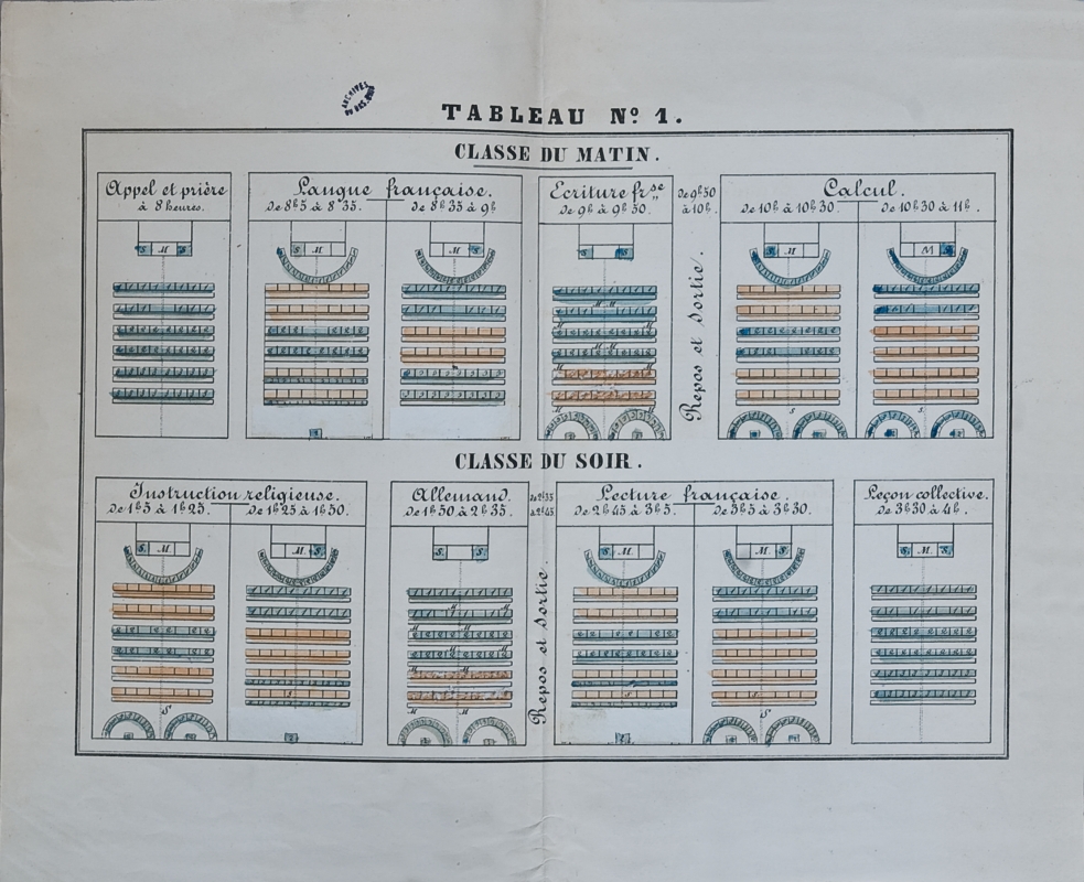 À l’extrémité de chaque table sont fixés les « tableaux de dictées » ainsi que des signaux télégraphiques indiquant les moments de la leçon, tel par exemple « COR » pour « correction » ou « EX » pour « examen du travail ». Des modèles de table demi-circulaire ont été ensuite proposés afin de faciliter le travail des moniteurs.