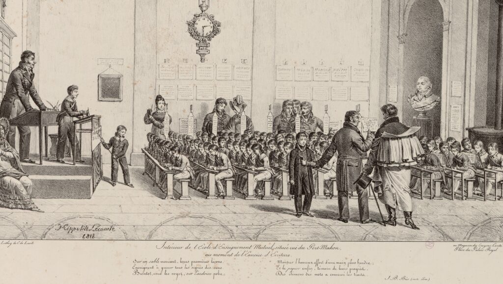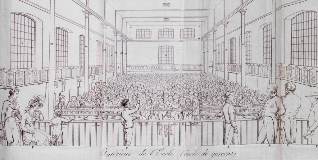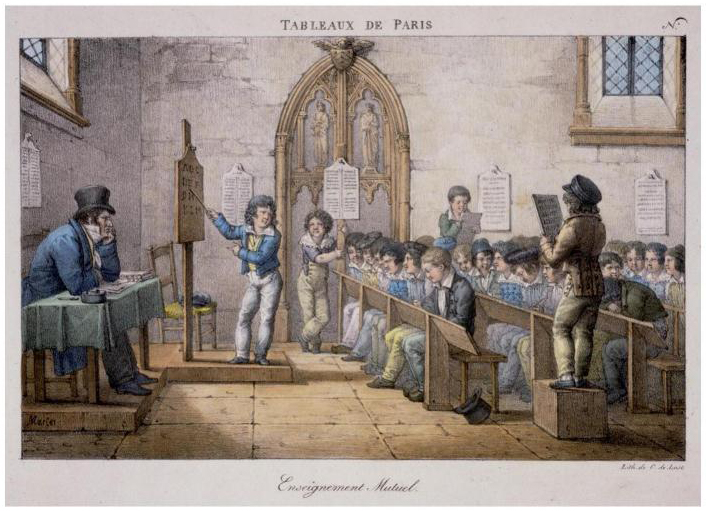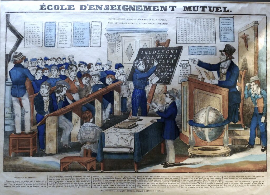 Au début du XIXe siècle, « l’enseignement mutuel » (parfois appelé système « monitorial » anglais, « système de Madras » ou « système de Lancaster »), se répand comme un feu de brousse en Europe puis à travers le monde.