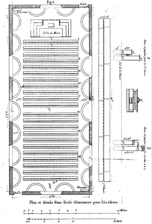 Il indique, par exemple, pour 350 élèves la nécessité d’une salle de 18 m de long sur 9 m de large. En Angleterre et dans les campagnes françaises, on utilise souvent une grange pour la nouvelle école. En France, les édifices religieux désaffectés depuis la période révolutionnaire sont nombreux et répondent parfaitement aux normes souhaitées. Ils accueilleront beaucoup d’écoles mutuelles.