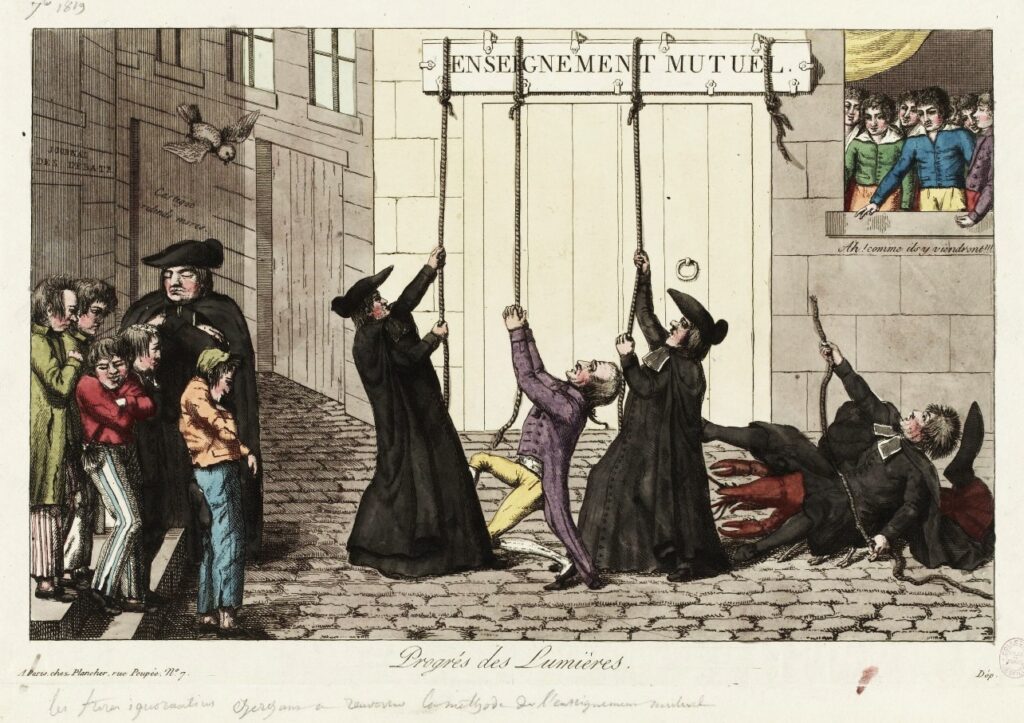 Anticipant la bulle papale par l’ordonnance d’avril 1824, l’enseignement mutuel est placé chez nous sous la stricte tutelle de l’Église traditionnelle qui s’empare de l’ensemble de la question éducative. En août, donc après la bulle de Léon XII, un ministère des « Affaires ecclésiastiques et de l’Instruction publique », dont l’appellation dit bien le retour de l’Eglise aux affaires, est créé. L’accession de Charles X, ne fera qu’aggraver cette situation. L’Église d’alors aime les Lumières, mais avant tout celles des bougies…