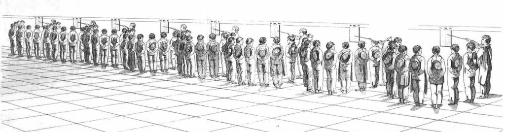 Les exercices oraux, en lecture, en arithmétique ou en dessin linéaire, à l’aide d’un tableau noir, se font debout, par groupes de 9 au maximum, les élèves se tenant côte à côte et formant un demi-cercle. De là, d’ailleurs, l’appellation donnée à ce genre d’activité : « travail au cercle ».