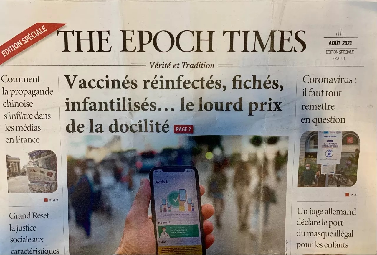 Le 14 août 2021, des militants de l’antenne française de la secte (sino-)américaine Falun Gong ont diffusé, dans les manifestations anti-pass sanitaire, The Epoch Times , un journal qui dénonce la Covid19 comme le « virus du Parti Communiste Chinois (PCC) ».
