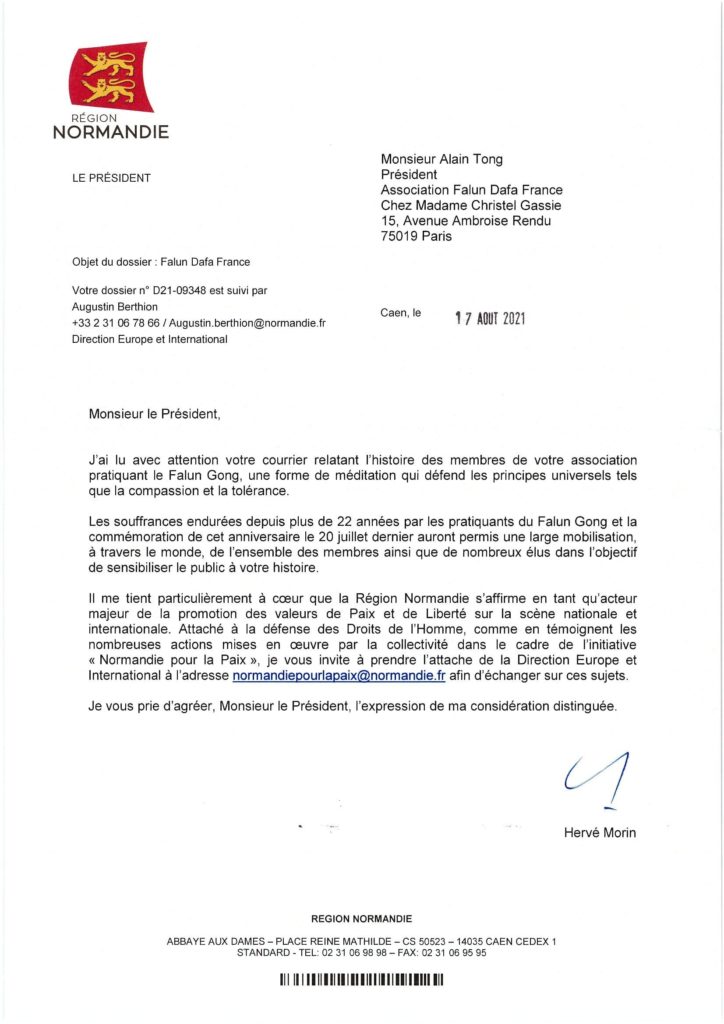En soutien au FG, Hervé Morin, ancien ministre de la Défense et actuel président du Conseil régional de Normandie, a envoyé le 17 août une lettre de soutien à Alain Tong, président de l’association Falun Dafa France, qui l’a publié aussitôt sur son site.