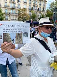 Or, en ce 14 août 2021, on a vu des militants de l’antenne française de la secte (sino-)américaine Falun Gong rejoindre les défilés pour y diffuser gratuitement leur journal The Epoch Times, le « journal chinois le plus largement publié dans le monde ». Pour ce journal, pas de doute, la Covid19 est le « virus du Parti Communiste Chinois (PCC) ».