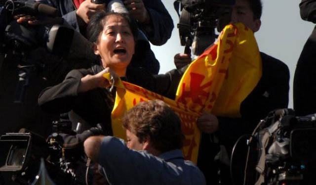 Le point culminant de l’affront fait à la Chine fut l’intervention de Wang Wenyi, une adepte du FG accréditée en tant que journaliste de l’Epoch Times, hurlant depuis la pelouse de la Maison-Blanche : « Le ciel détruira les communistes chinois », « Quittez le Parti », « 10 millions de héros ont quitté le parti, quand allez-vous partir ? » et « Pratiquer le Falun est génial ».