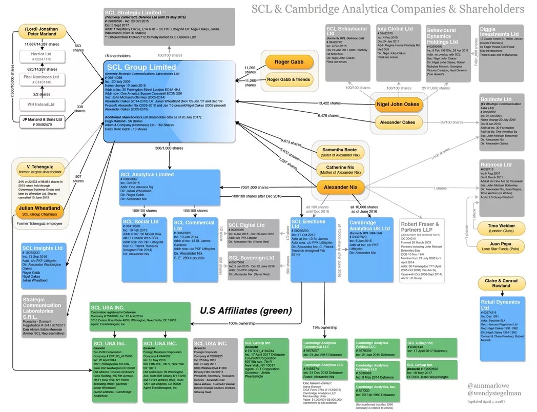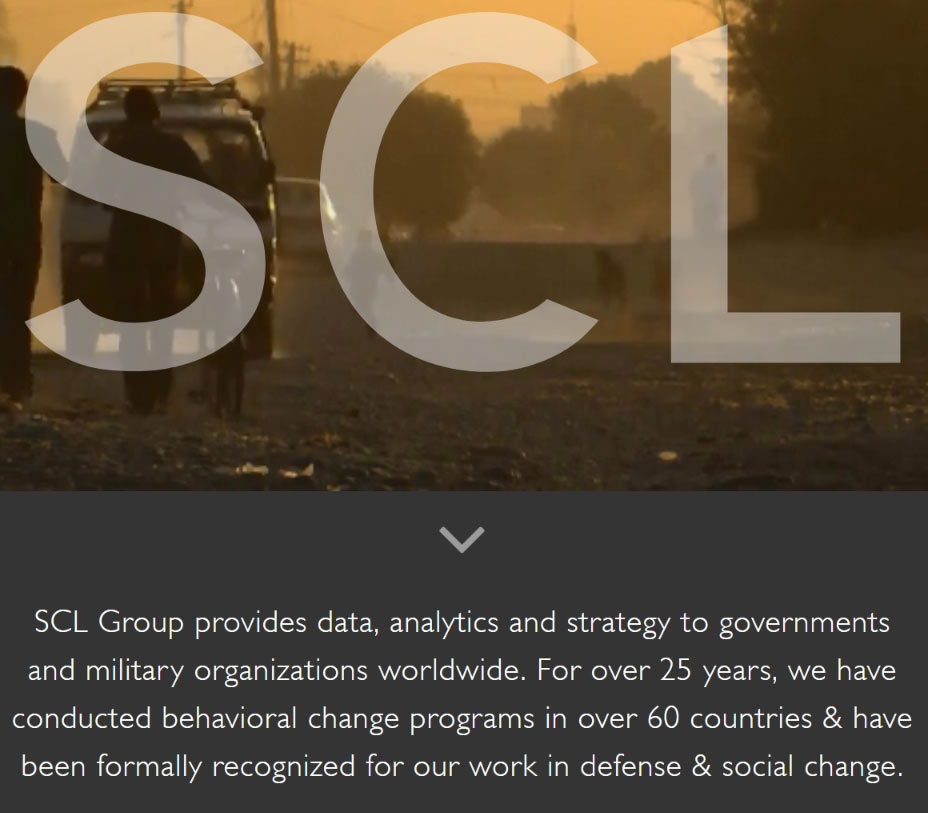 A l’origine, le groupe SCL était une société britannique privée fondée en 1990 par l’entrepreneur anglais Nigel Oakes afin de mettre les progrès de la psychométrie et de la psychologie comportementale au service de la communication stratégique (militaire, gouvernementale, affairiste ou le plus souvent électorale et politique) en les combinant à ceux du traitement quantitatif des données. SCLE (ou SCL Elections Ltd) s’est décrite comme une « Agence mondiale de gestion des élections »)...