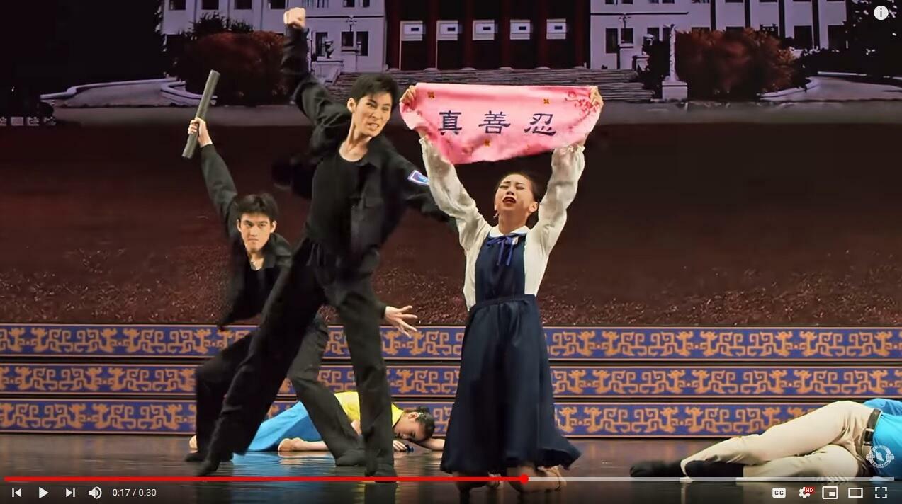 L’argumentaire de Shen Yun est qu’ils produisent des spectacles qui s’inspirent de 5000 ans de culture chinoise et en font donc la promotion. Peut-être. Leurs danses sont basées sur divers mythes et légendes chinois, comme le Voyage du singe vers l’Ouest, et sur les communautés ethniques chinoises, mais il y a aussi des pièces de danse contemporaine avec quelque chose de très, très étrange : (…) des voyous de la police vêtus de noir avec des insignes rouges en forme de marteau et de faucille sur leurs chemises. Ils battent sans raison les citoyens doux et méditants qui brandissent une pancarte indiquant que le Falun Dafa est bon. Oui, la police chinoise a battu des membres du Falun Dafa ou du Falun Gong et les a persécutés. Ce n’est pas le problème ici, mais, encore une fois, j’ai payé 90 dollars le billet pour voir plusieurs numéros de danse qui étaient de la propagande contre le gouvernement chinois. Il n’y avait pas d’équilibre là-dedans, pas de contexte, pas de mise en garde du public sur le fait que c’était leur intention. Ces vignettes, je crois qu’il y en avait quatre, n’étaient cependant pas la partie la plus étrange de la soirée. À quatre reprises pendant le spectacle, les danseurs restaient hors de la scène et soit un chanteur en smoking, soit une chanteuse en robe de soirée, chantaient de courts vers, peut-être des chansons, qui énonçaient une partie du dogme du Falun Dafa.