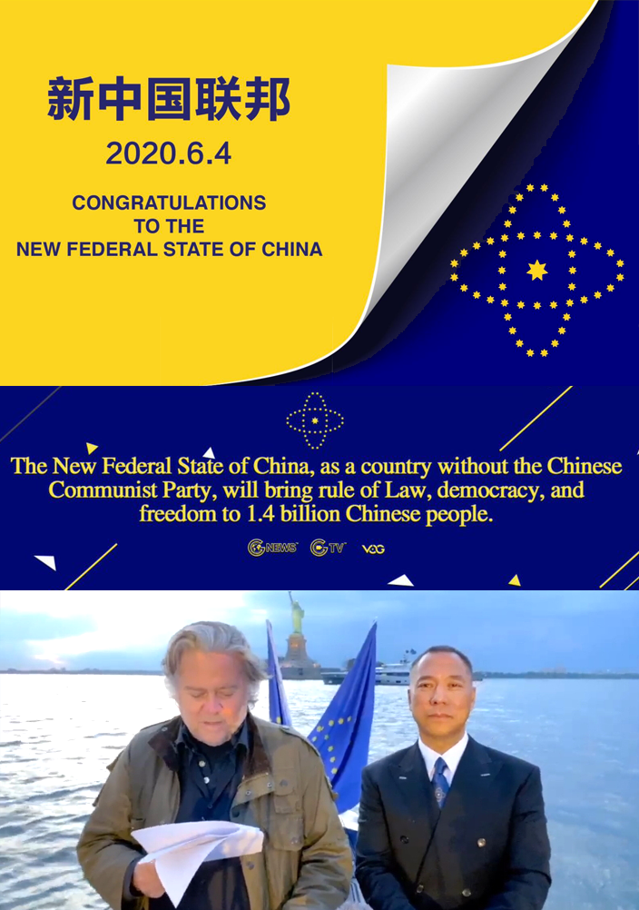 Le 4 juin 2020, Steve Bannon, avec l’appui de Guo Wengui, un milliardaire douteux chinois exilé aux Etats-Unis et un proche ami de Tony Blair, a créé le « Nouvel Etat fédéral de Chine », un nouveau groupe de pression dont le but déclaré est de renverser le PCC en tant que gouvernement chinois.