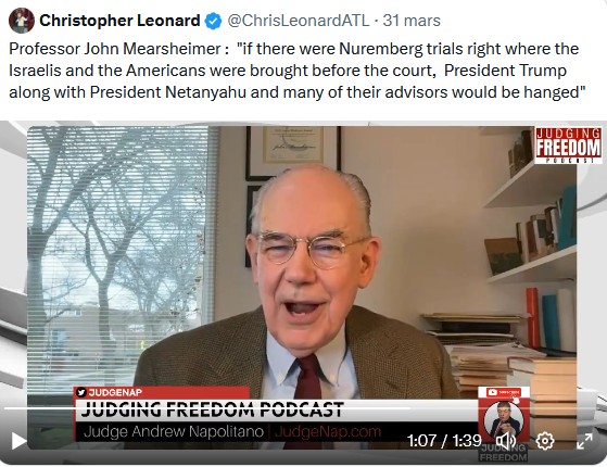 Le 31 mars 2026, s’exprimant dans le podcast de l’ancien juge et collaborateur de longue date de Fox News, Andrew Napolitano, le professeur John Mearsheimer — professeur émérite de sciences politiques à l’Université de Chicago — a affirmé qu’il n’y avait aucun fondement juridique aux attaques américaines et israéliennes contre l’Iran.