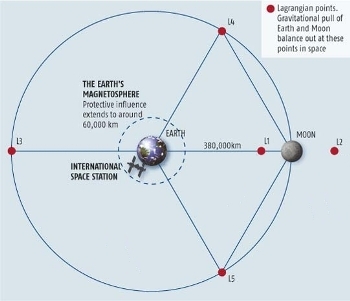 Quand deux corps célestes interagissent comme la Lune et la Terre, il existe des points dans l’espace où un objet ne tombe ni sur l’un ni sur l’autre : il reste suspendu et tourne lentement comme le fait le système des deux corps et non pas rapidement autour de l’un des deux. Deux de ces positions, qui sont au nombre de 5, sont plus stables que les autres : Les points L4 et L5. Ils sont plus intéressants comme lieu d’assemblage des grands objets qui sont destinés à sortir du système Terre-Lune avec des éléments constituants qui proviennent des deux planètes, et permettent un accès plus facile à la Terre ou à la Lune. De plus, les volumes et les masses des vaisseaux en construction à ces Points ne seront pas pénalisés par une gravité ou un manque de place.