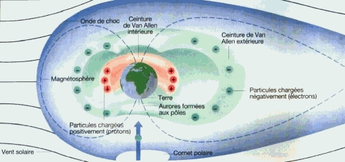 Le champ magnétique terrestre interagit aussi avec le vent solaire, essentiellement composé d’hydrogène, et forme un bouclier appelé « la magnétosphère ». Un sous-ensemble de cette magnétosphère a la forme d’un tore et a été décrit par Van Allen après que le premier satellite américain Explorer ait vu ses compteurs Geiger saturés.