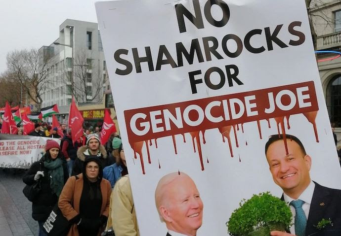 Les Irish Americans pour la Palestine avaient appelé la délégation irlandaise à boycotter la Maison Blanche le jour de la Saint-Patrick. Comme résultat, pour les célébrations du Saint Patron irlandais, Biden n’a reçu que Leo Varadkar, le Premier ministre de la République d’Irlande, et la Première ministre d’Irlande du Nord, Michelle O’Neill. Les autres, notamment la dirigeante du Sinn Fein, Mary Lou McDonald, ont refusé d’y assister. Selon l’agence Reuters, Leo Varadkar a déclaré qu’il comptait dire à Joe Biden que les Irlandais veulent « un cessez-le-feu immédiat, que les tueries cessent, que les otages soient libérés sans condition, que de la nourriture et des médicaments soient acheminés à Gaza ».