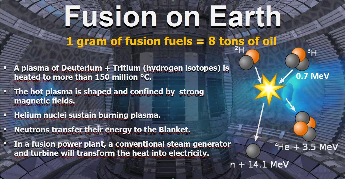 Comme vous le voyez sur cette diapositive, l’énergie des noyaux d’hélium est cinq fois supérieure à celle des éléments qui entrent en collision, et celle des neutrons leur est 20 fois supérieure. Ces deux particules (neutrons et hélium) vont chauffer la paroi et convertir leur énergie cinétique en chaleur. C’est ainsi que nous pouvons produire de l’énergie avec la fusion de l’hydrogène. Le point positif est qu’il y a une très grande densité d’énergie dans ce phénomène, puisque un gramme de combustible de fusion équivaut à huit tonnes de pétrole.