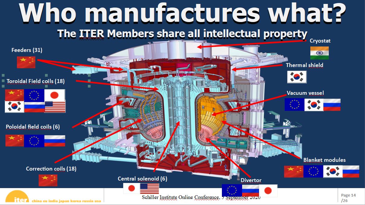 Parce que tous les membres sont réellement convaincus que la fusion de l’hydrogène pourrait être une percée pour l’avenir de l’approvisionnement énergétique mondial, chacun paie sa contribution « en nature » pour le projet en produisant divers composants de l’équipement. Dans ces conditions, chaque pays a pu mobiliser le meilleur de ses industries pour démontrer la faisabilité et la capacité de fabrication des grands composants tels que les bobines magnétiques, la chambre à vide et tous les autres équipements.