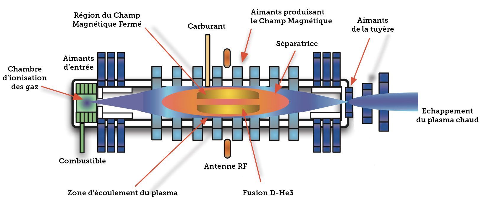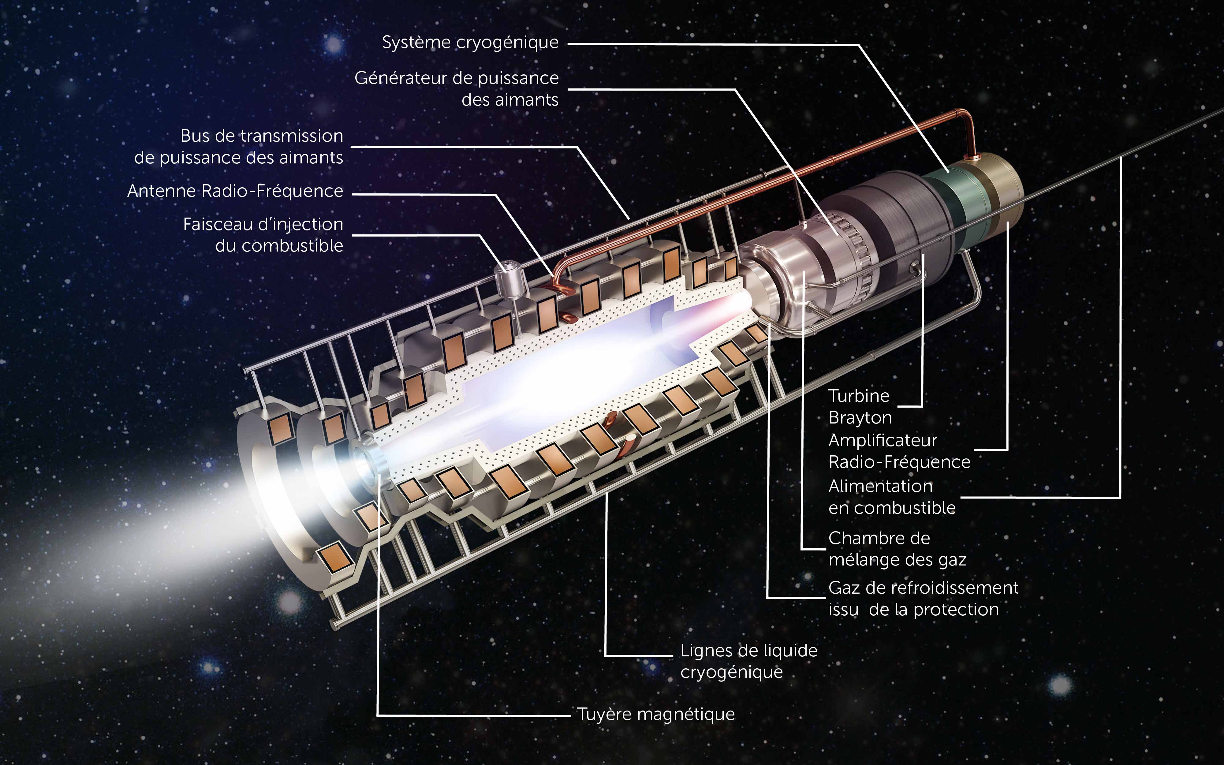 Une fois que vous avez ionisé le gaz, vous continuez à le chauffer, jusqu’à atteindre des températures suffisamment hautes pour provoquer la fusion. Avec la fusion enclenchée, vous obtenez les produits de la réaction, l’hélium-4 et le proton, qui sont électriquement chargés et peuvent être manipulés avec des champs magnétiques dans ce qu’on appelle une « tuyère magnétique ». Si vous regardez la navette spatiale quand elle décolle, vous voyez les tuyères diriger le gaz propulseur – vous pouvez voir les tuyères pivoter. Mais si vous utilisiez une tuyère ordinaire avec des plasmas à haute température, vous feriez fondre la tuyère. C’est pour ça que l’on met un champ magnétique dans la tuyère pour diriger le flux de plasma.