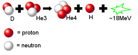 L’énergie libérée par cette réaction de fusion, appelée réaction D-He3 ou deutérium-hélium-3, est égale à 18 millions d’électron-volts.