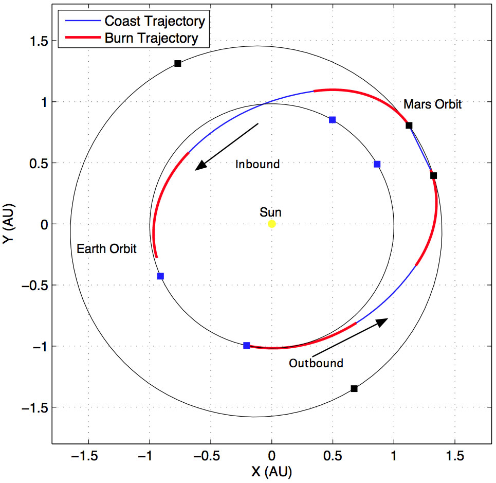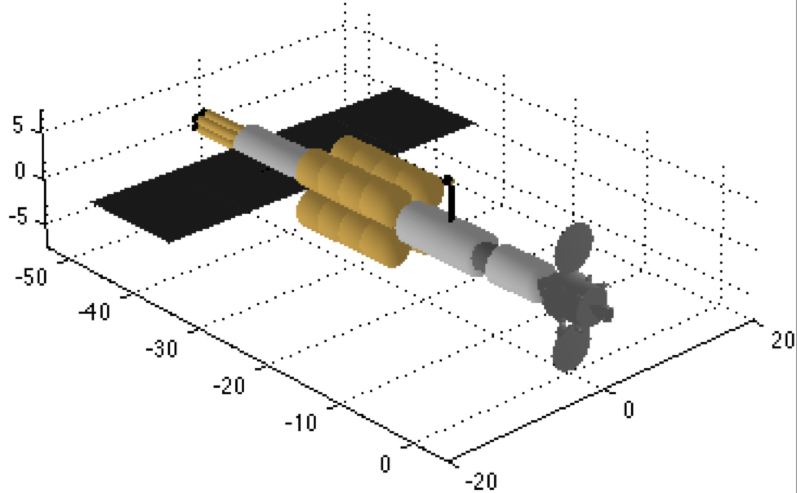 Une mission aller-retour vers Mars prendra seulement 310 jours, incluant 30 jours en orbite de Mars (voir la Fig. 7). Le DSH est propulsé par six moteurs DFD. Chaque moteur produit 11,5 Mégawatts de puissance électrique, donc l’ensemble des moteurs produira 70 Mégawatts, ce qui correspond à la puissance d’un très gros porte-avions nucléaire comme le USS Nimitz.
