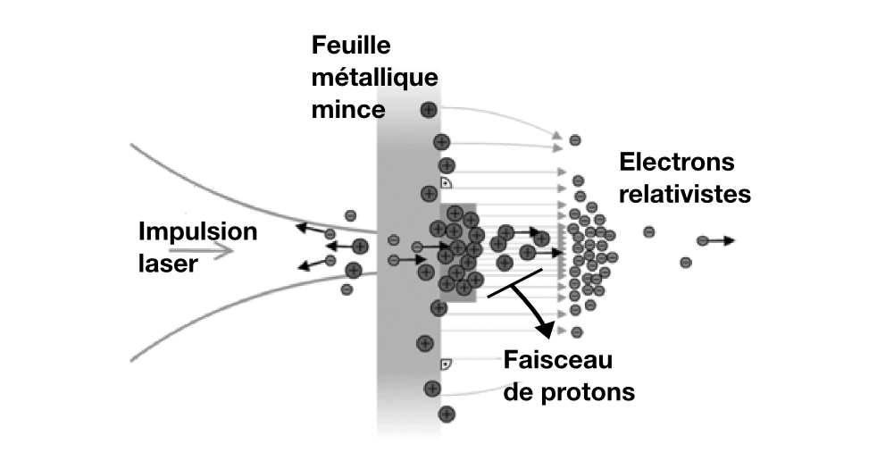 Pour la production du faisceau de protons, nous utilisons une feuille mince, sur laquelle nous focalisons le faisceau laser en impulsion courte, et les électrons rapides (avec des vitesses proches de celle de la lumière) qui sont produits sur la face avant de la feuille, la traversent pour la quitter par la face arrière en emportant avec eux les ions les plus légers qui se trouvent sur cette face.