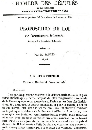 Là encore, tout les oppose a priori. Dans L’Armée nouvelle (1911), Jaurès élabore, proposition de loi à l’appui, une armée de miliciens composée de citoyens-soldats appartenant à l’armée d’active et formés tout au long de leur vie, dirigée par des officiers issus du rang. Il est en opposition totale avec la structure militaire établie, basée sur une armée d’élite permanente dirigée par des officiers professionnels issus de l’aristocratie.