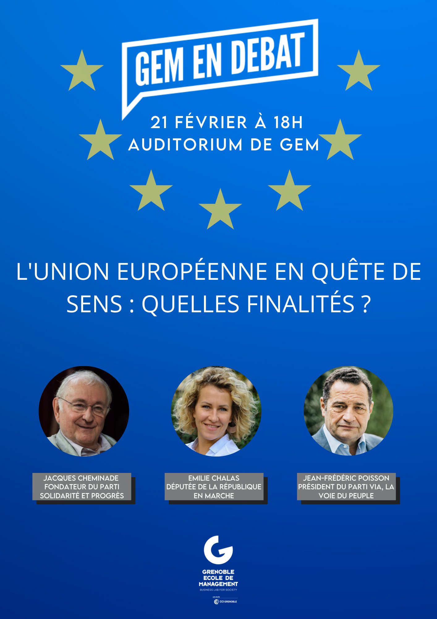 Lundi 21 février à 18h, Jacques Cheminade participera à une table ronde organisée par l’association étudiante « Gem en Débat » sur le thème « L’Union Européenne en quête de sens : quelles finalités ? », à l’École de Management de Grenoble.