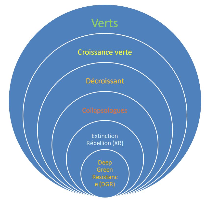 Afin de ne pas mettre tout le monde dans le même sac et de pouvoir articuler des réponses, il n’est pas inutile de distinguer, au sein de l’écolo-sphère, plusieurs composantes, par ordre croissant de radicalité et potentiellement de violence, et chacune contribuant à créer un environnement intellectuel dominant :