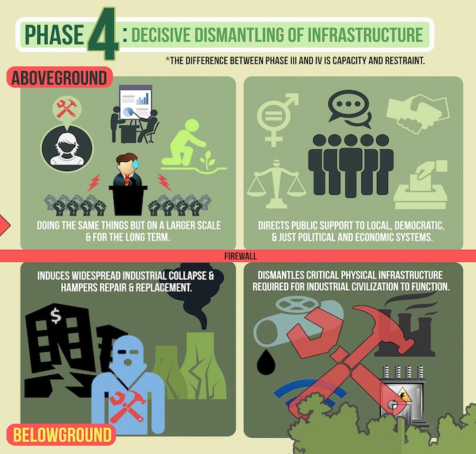 Sur son site, ce mouvement annonce le début de la « Guerre écologique décisive », dont le but, dans la phase IV, est de « démanteler autant que possible l’infrastructure industrielle basée sur les combustibles fossiles » :