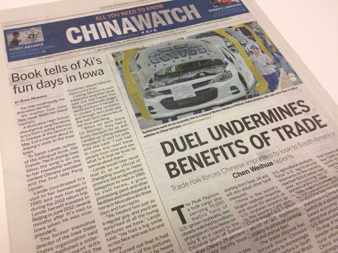 Il faut dire que les provocations américaines à l’égard de la Chine se multiplient ces derniers jours. Comme nous l’avons rapporté dans la précédente chronique, Donald Trump a publiquement accusé la Chine, lors de sa conférence de presse aux Nations unies, de s’ingérer dans les élections de mi-mandat, qui auront lieu le 6 novembre prochain. Seule « preuve » apportée, un supplément paru le 23 septembre dans l’édition du dimanche du Des Moines Register, le principal quotidien de l’État de l’Iowa, payé par le quotidien chinois China Daily, afin d’y déplorer les effets négatifs de la guerre commerciale sur les échanges entre l’Iowa et la Chine. Le président américain a ainsi estimé que la Chine cherchait à induire les électeurs du monde agricole à voter pour des candidats anti-Trump. Chose notable, à la une du supplément paraissait également la revue d’un livre rappelant les très bonnes relations de Xi Jinping avec l’Iowa.