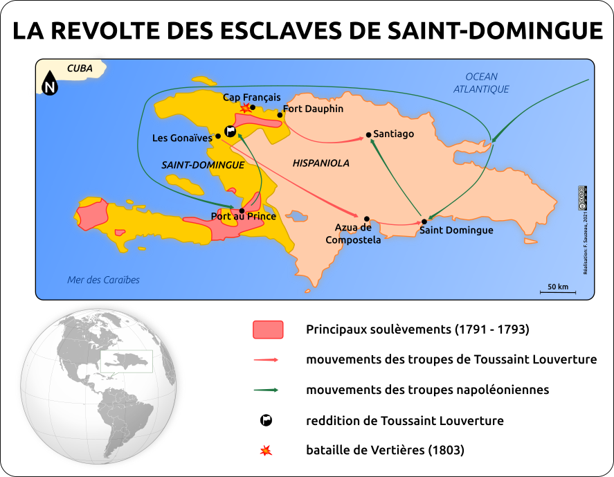En août 1791, dans la « partie française de Saint-Domingue » (actuelle Haïti), des dizaines de milliers d’hommes et de femmes originaires d’Afrique, victimes de la traite esclavagiste transatlantique, s’insurgent. Sous la pression de ce soulèvement et de la guerre aux frontières, les autorités coloniales françaises décrètent, le 29 août 1793, l’émancipation immédiate des 500 000 esclaves.