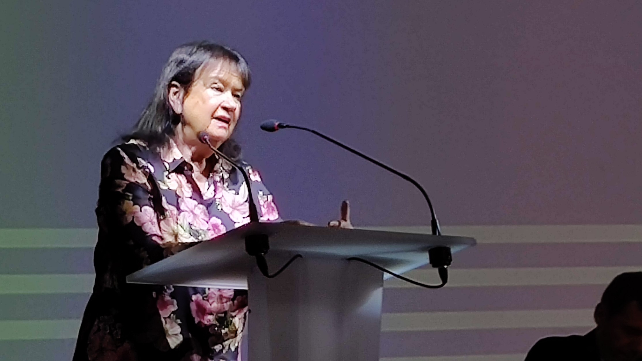 (S’exprimant d’abord en français) : Bonjour Mesdames et Messieurs. Je suis très heureuse d’être à Paris avec vous. Heureuse parce que je suis une réfugiée d’Allemagne, un pays où il n’y a pas de souverainistes. Mais moi, je suis une souverainiste !