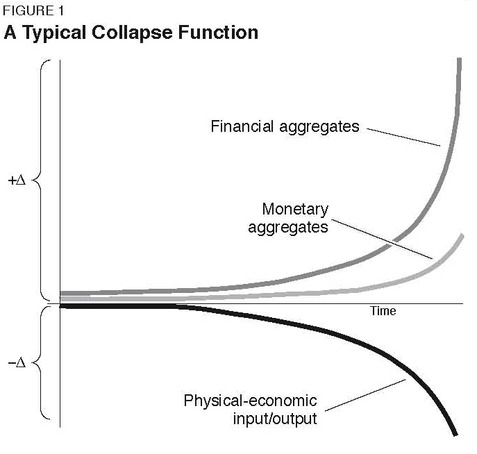 Ce gouffre entre économie monétaire et économie réelle fut schématisé par Lyndon LaRouche en 1995, dans son graphique de « triple courbe », figure 1.