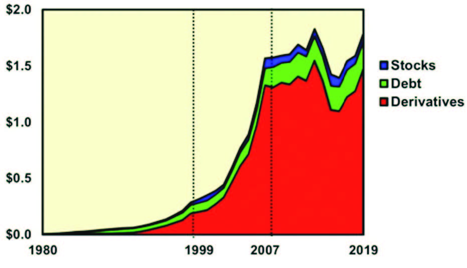D’après les dernières statistiques de la Banque des règlements internationaux (BRI), la valeur notionnelle des produits financiers dérivés a augmenté de 20 % entre 2018 et juin de cette année pour atteindre les 640 000 milliards de dollars. En général, on s’accorde à dire qu’en réalité, leur montant est plutôt le double du chiffre officiel, lorsqu’on les évalue à partir de la hausse du commerce (+3%) et du PIB mondial (+2,9 %).