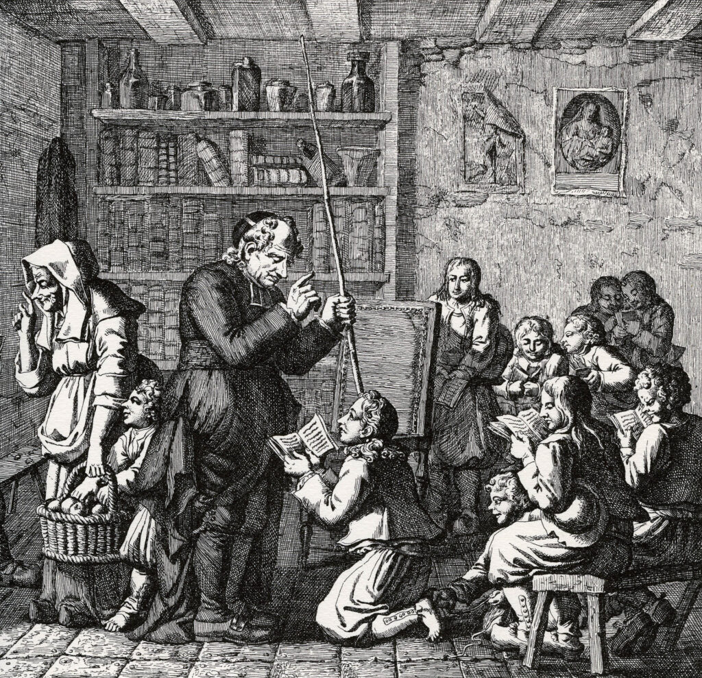 En France, dès le XVIe siècle, l’Etat royal confie à l’église catholique (Jésuites, Oratoriens) le soin de former les enfants de la noblesse : seules les familles aisées arrivent à payer un précepteur pour les leurs, les autres, souvent qualifiés de personnes « n’étant pas faites pour des études », restent essentiellement analphabètes.