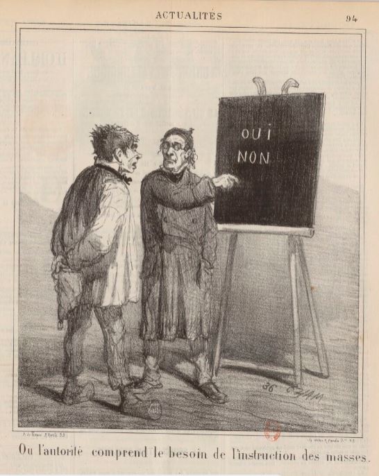 Sur le plan de l’instruction, en 1848, la situation reste désastreuse. Sur 300 000 conscrits, plus de 112 000 ne savent ni lire, ni écrire. Si l’on prend les plus âgés, la proportion est encore supérieure à ce tiers. D’où l’arrêté du 8 juin, qui institua à Paris des lectures publiques du soir, « destinées à populariser la connaissance des chefs-d’œuvre de notre littérature nationale ». Elles devaient avoir lieu deux fois par semaine, « dans différents locaux situés, autant que possible, au sein des quartiers les plus populeux de Paris ».