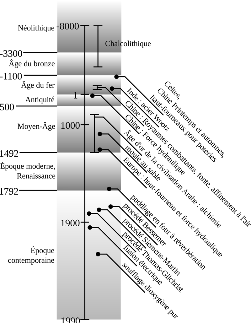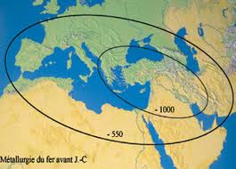 3. L’âge de fer (-1500 au Proche-Orient, -900 en Europe). La première apparition du fer se situe entre 1650 et 1700 avant notre ère, chez les Hittites et les Chalybes, peuples d’Asie mineure, une région riche en mines de fer. Ils transmettront leur savoir-faire aux Étrusques et aux Gaulois.