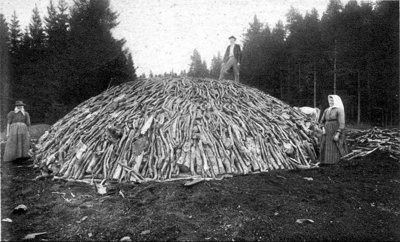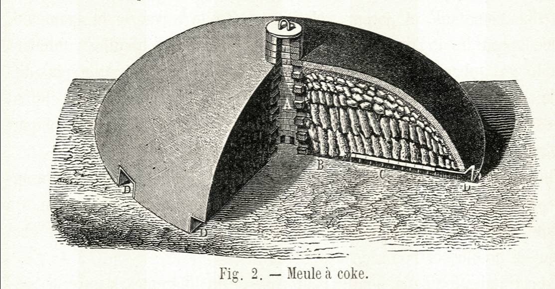 L’on entasse du charbon comme du bois dans des meules que l’on couvre d’argile. La cheminé interne de la meule va chauffer le charbon sans oxygène.