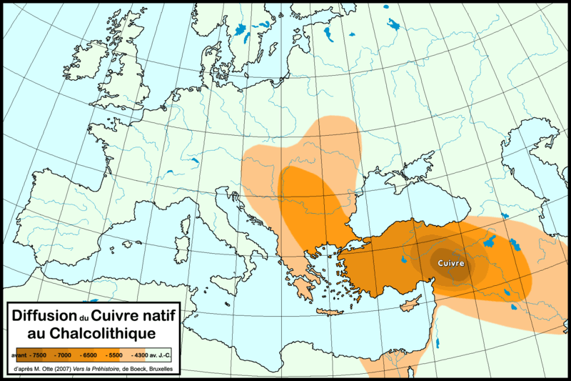 1. L’âge de cuivre (-5500 à -3000 av. JC) ou chalcolithique (de chalco, cuivre et lithos, pierre) désigne les sociétés néolithiques qui utilisent la pierre mais s’ouvrent petit à petit à l’usage des premiers métaux : le cuivre et l’or. Les plus anciennes traces d’une culture ayant employé ces deux métaux ont été retrouvées en Bulgarie, à Varna, une localité située aux abords de la mer Noire. On y trouve quelque deux cents sépultures (4600 et 4200 ans avant JC) contenant de nombreux objets (parures, armes, offrandes).