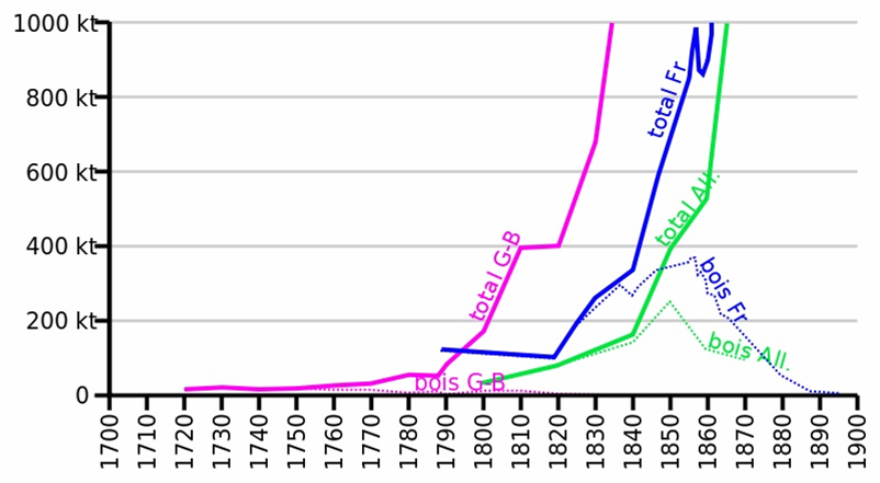 Ainsi en France, en 1860, un tiers de la fonte était encore produit dans des hauts fourneaux au charbon de bois.