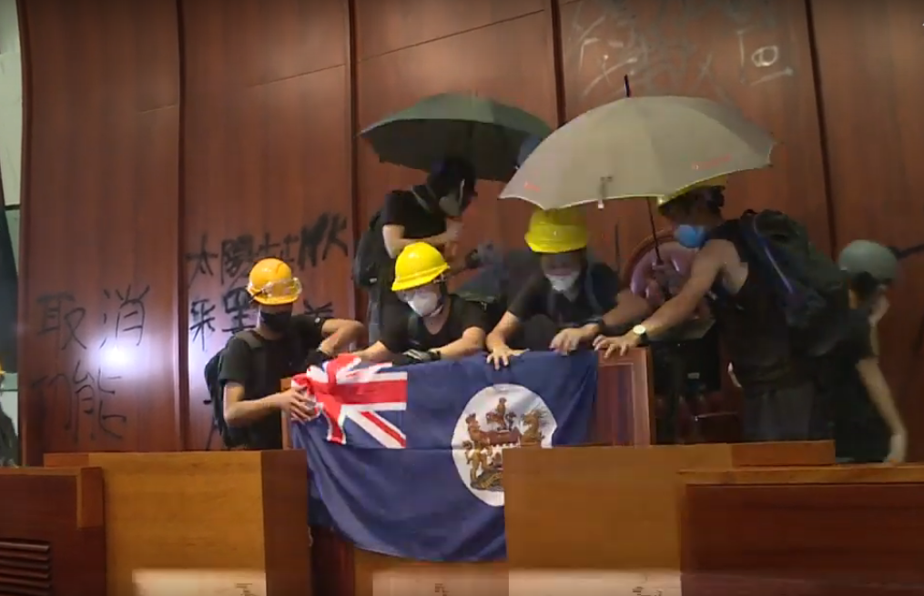 La nature provocatrice est devenu manifeste le 1er juillet, jour anniversaire de la rétrocession de Hong-Kong, lorsqu’un groupe de quelques centaines d’activistes ultra-violents ont forcé l’entrée et envahi le Parlement, les visages masqués, coiffés de casques de chantier. Les émeutiers, qui font partie d’un groupuscule se nommant le « Mouvement pour l’autonomie de Hong-Kong » (Hong-Kong Autonomy Movement) et prônent la destruction des bâtiments officiels du pouvoir central chinois – ont arboré l’ancien drapeau colonial britannique au sein de l’hémicycle. Curieuse façon de défendre son indépendance...