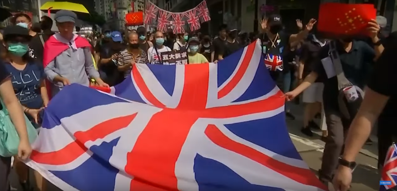Devant le consulat britannique, les manifestants ont brandi une bannière disant « ’One country, two systems’ is dead » (« ’Un pays, deux systèmes’ est mort »), et ont demandé au Royaume-Uni d’accorder la citoyenneté britannique aux centaines de milliers de Hongkongais détenant des passeports britanniques. « Nous sommes Britanniques et nous ne nous rendrons jamais », scandaient-ils. Quelques jours plus tôt, ils s’étaient rendus devant le consulat des États-Unis, avec des drapeaux américains, pour appeler explicitement à une intervention dans le conflit social qui anime l’île depuis quelques mois. Une bien étrange manière de revendiquer l’indépendance de Hong-Kong qui doit faire saliver les nostalgiques de l’Empire à Londres…