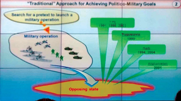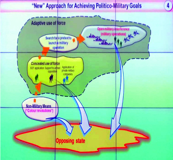 Le chef d’état-major de l’Armée russe, le général Guérassimov, considère lui aussi qu’il s’agit d’une nouvelle méthode de combat adoptée par les Etats-Unis. Cela commence avec les tactiques non-militaires de la révolution de couleur, mais derrière se tient la force armée, et si le potentiel de révolte n’est pas suffisant, on n’hésite pas à l’utiliser ouvertement pour renverser le régime, comme nous l’avons vu en Ukraine, en Syrie et dans maints autres endroits.