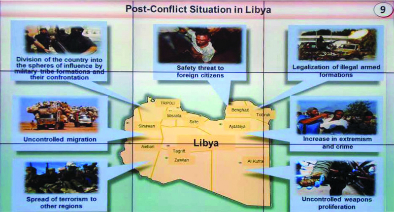 Voici des diapositives powerpoint montrées lors de la conférence. Le ministre de la Défense Choïgou a souligné par la suite que les prétendues protestations populaires sont accompagnées de moyens militaires et de guerre irrégulière (figure 6). Ces moyens ont été utilisés en Serbie, en Libye, en Ukraine, au Venezuela et au cours du « printemps arabe », qui a déstabilisé tout le nord de l’Afrique (figure 7). Le résultat est que certains pays africains sont sur le point de se désintégrer. Après les événements en Libye, les Touaregs et autres groupes se sont enfuis au Mali, ainsi que vers d’autres pays, répandant le terrorisme.