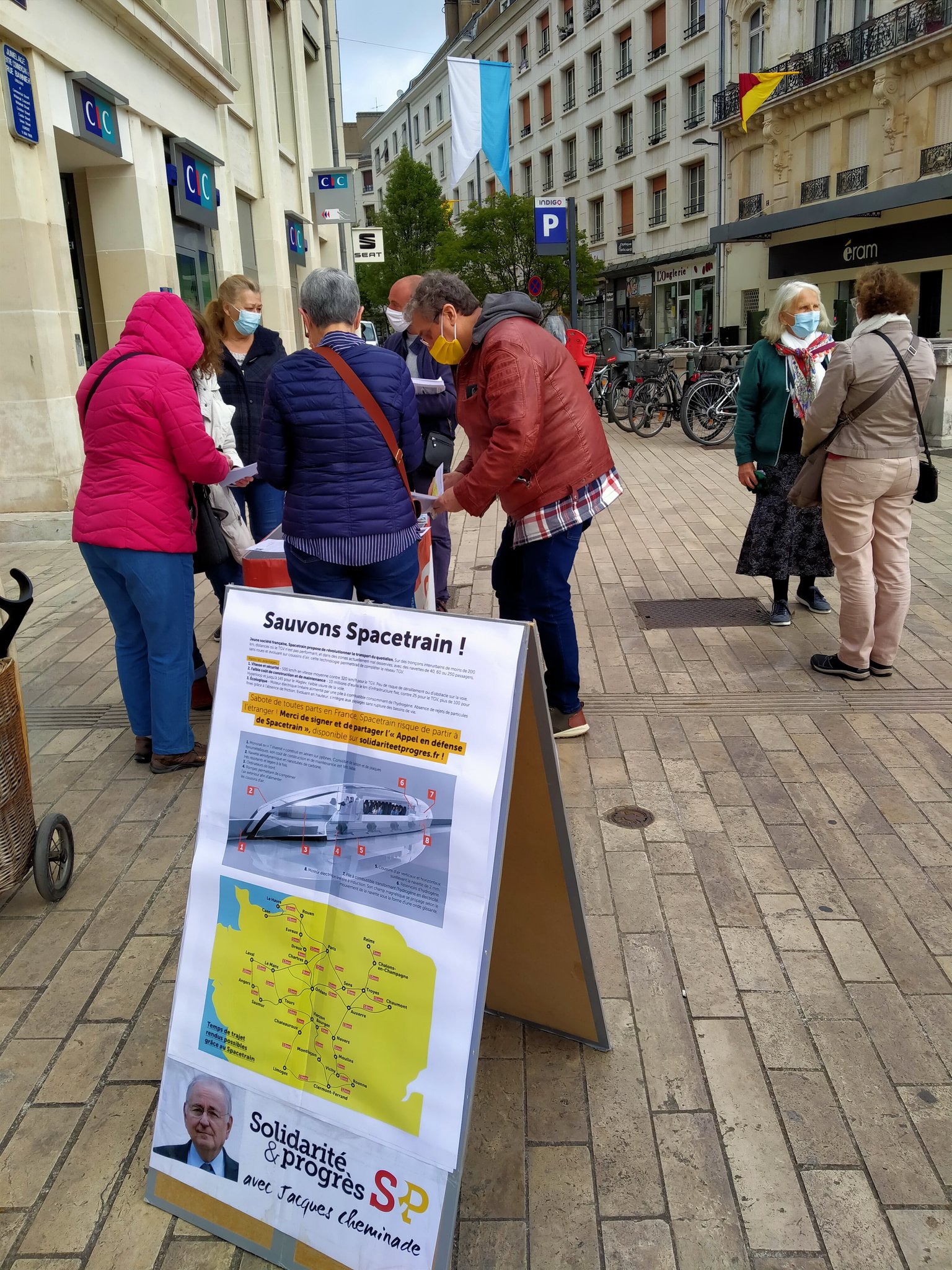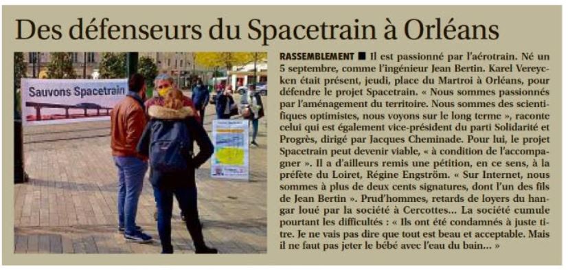 Jeudi 29 avril, des militants S&P ont tenu un stand à Orléans en défense du Spacetrain, descendant potentiel de l’aérotrain de Jean Bertin, et menacé d’étouffement administratif.