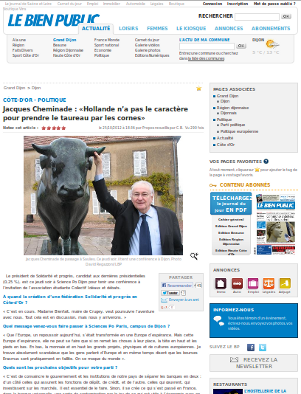 Cet évènement n’est pas passé inaperçu pour le Bien Public, qui a posé la question, lors de son interview avec M. Cheminade, de la création d’une fédération locale de Solidarité et Progrès en Côte-d’Or. Ce séjour a justement été l’occasion de tenir une table militante dans les rues de Dijon et de rencontrer les sympathisants prêts à faire résonner localement notre campagne nationale et internationale pour une séparation stricte des banques et un système de crédit. C’est le cas de ces élus que Jacques Cheminade a rencontrés les 26 et 27 octobre et qui, pour la plupart, avaient eu assez de caractère et de courage pour lui accorder leur parrainage afin qu’il puisse être candidat aux présidentielles.