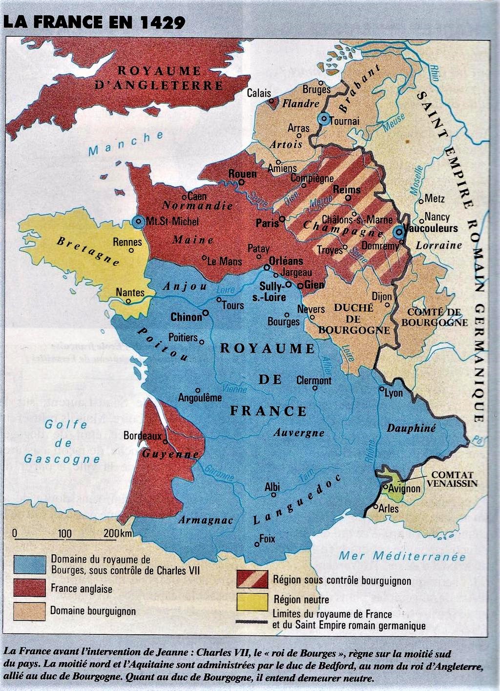 Bien que le traité de Troyes (1420) déshérite le dauphin du royaume de France au profit d’un cadet de la maison des Plantagenêts, Charles VII ne s’en proclame pas moins roi de France à la mort de son père le 21 octobre 1422. Chef de fait du parti armagnac, replié au sud de la Loire, il voit sa légitimité et sa situation militaire nettement s’arranger grâce à l’intervention de Jeanne d’Arc (1412-1431), opérant sous la protection bienveillante de la belle-mère du dauphin : Yolande d’Aragon (1384-1443), duchesse d’Anjou, reine de Sicile et de Naples. [1] Jeanne participe à la levée du siège d’Orléans et fait sacrer Charles VII, en juillet 1429, comme roi de France à Reims. Yolande d’Aragon noue des contacts avec les Bourguignons préparant la paix et introduit Jacques Coeur à la cour royale. [2] Une chronique de l’époque dit d’elle qu’elle était considérée « comme la plus sage et la plus belle princesse de la chrétienté ». Selon son petit-fils Louis XI, elle avait « un cœur d’homme dans un corps de femme ».